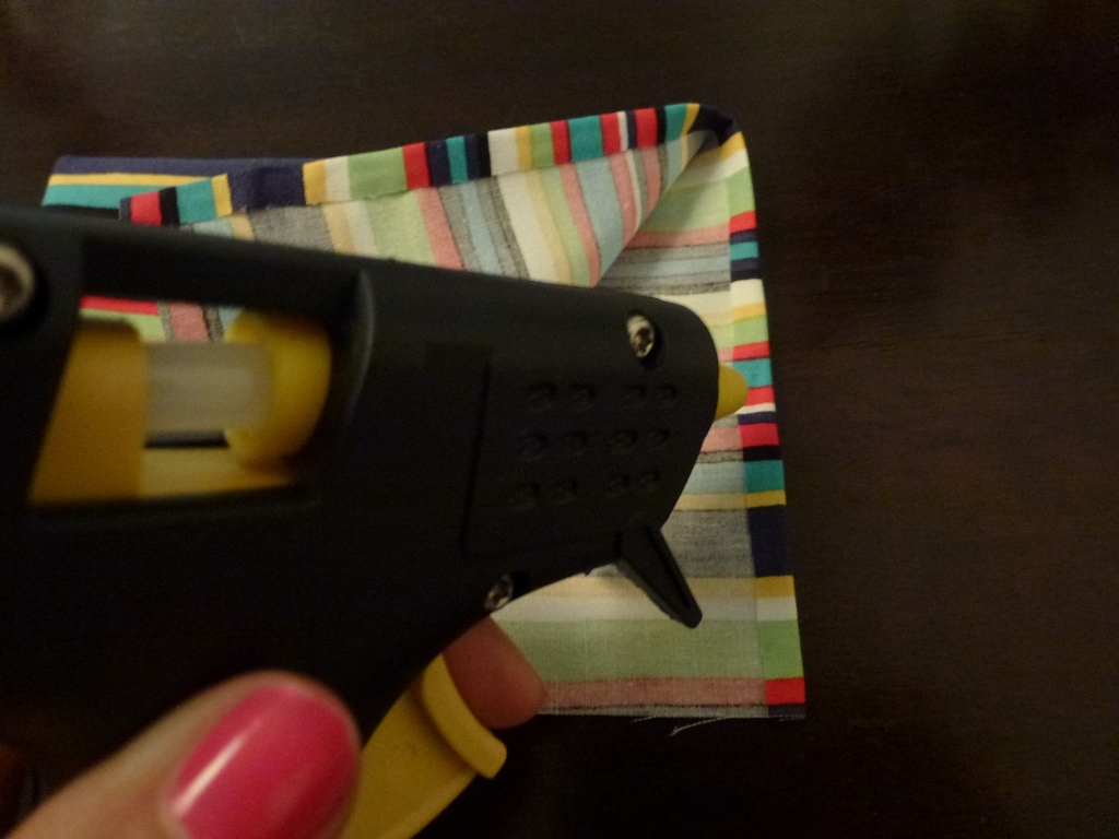 If using a hot glue gun, repeat steps above until you have cut the hole. Fold over the long edges and glue down.